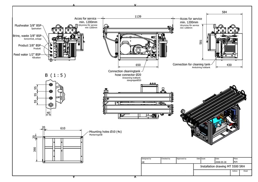 Размеры установки обессоливания с диаметрами присоединительных патрубков и несущей рамой.