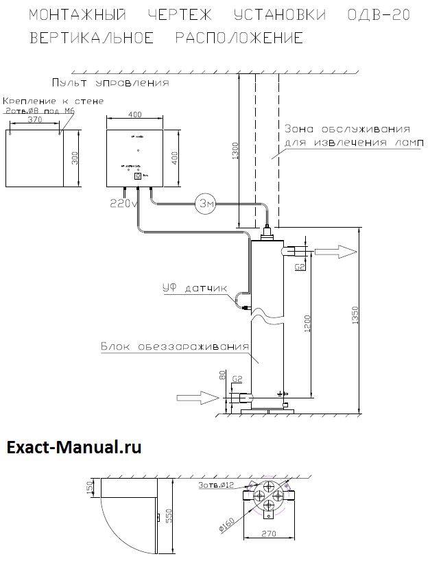 В составе крепление к стене пульта управления, блок обеззараживания в вертикальном исполнении, зона обслуживания для извлечения УФ ламп с размерами шкафа управления и диаметром присоединяемых трубопроводов.